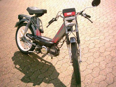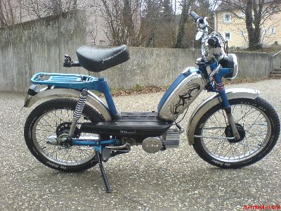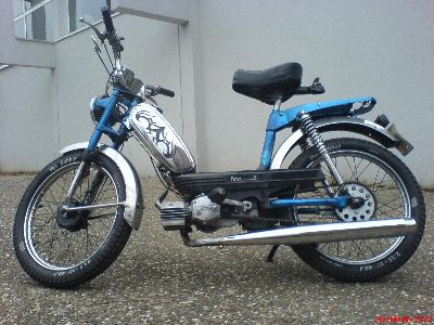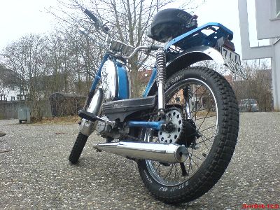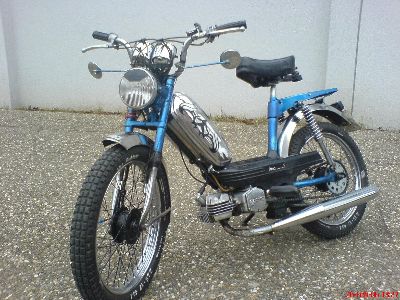 Optisches Tuning : Rahmen und diverse Teile wurden Glanzmetallic-blau lakiert. Schutzbleche, Stoßdämpfer, Spiegel, Tank, Auspuff, Lenker, Hinterbremse, Bremsstange, Felgen, Beide Sachsdeckel und Tach mit Drehrzahlmesser sind Vollverchromt! Kleinigkeiten sind Bößer Blick, Seitenständer, weißer hintergrund bei Tacho (bis 140) und Drehzahlmesser, Tribals auf Beiden Tankseiten. Weiße Schrift auf Reifen, vorne und hinten 2.50 Crossreifen mittelgrob. Digitaltacho zusätzlich, damit ichs immer ganz genau habe! (mit Licht). Spielzeug sind Hupe, und Lichthupe und Blaue Unterbodenbeleutung mit Batterie.